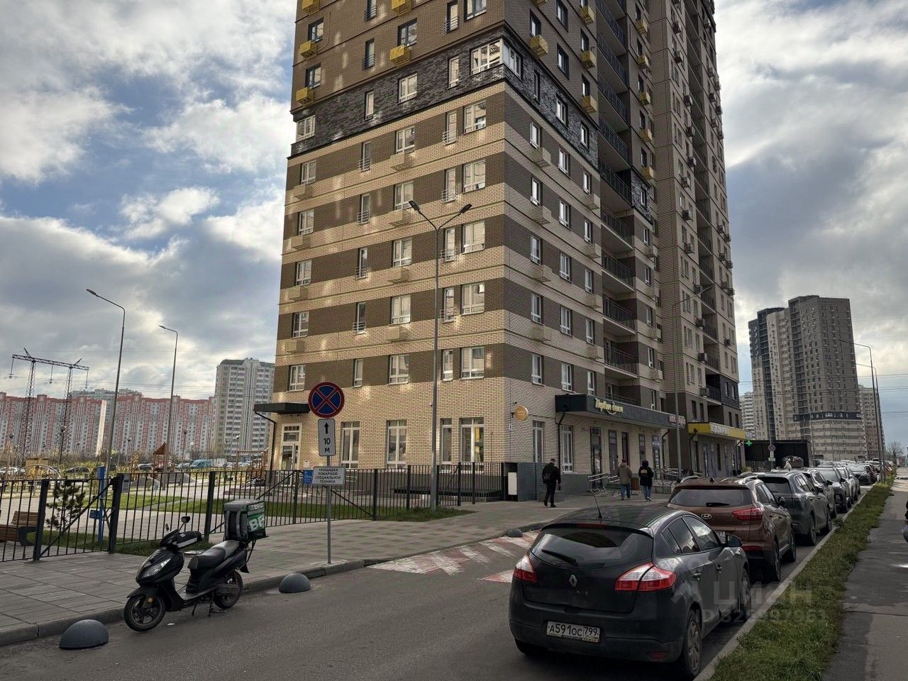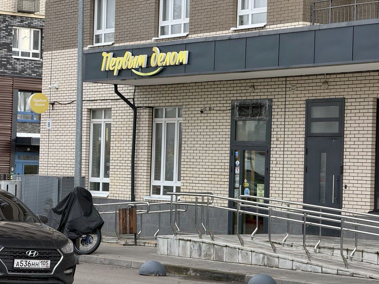 Фасад выходит на улицу, с интенсивным автомобильным трафиком. Рядом есть парковка.