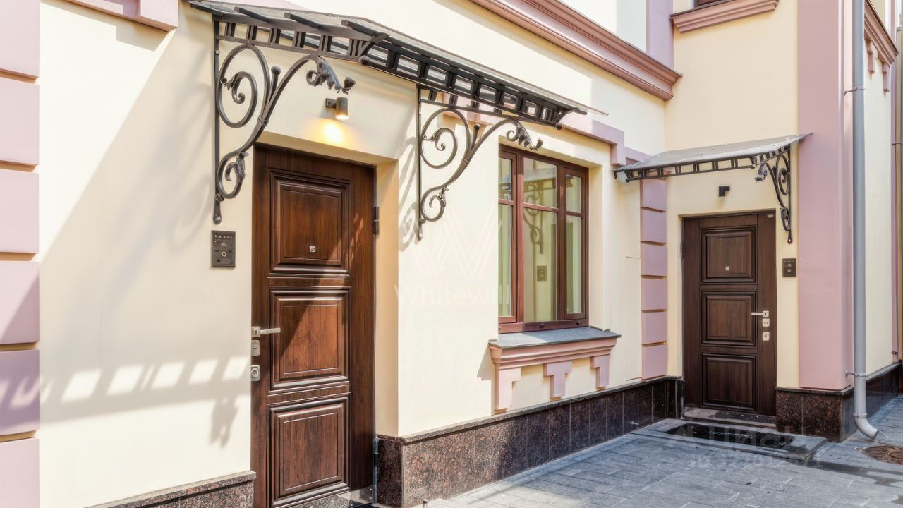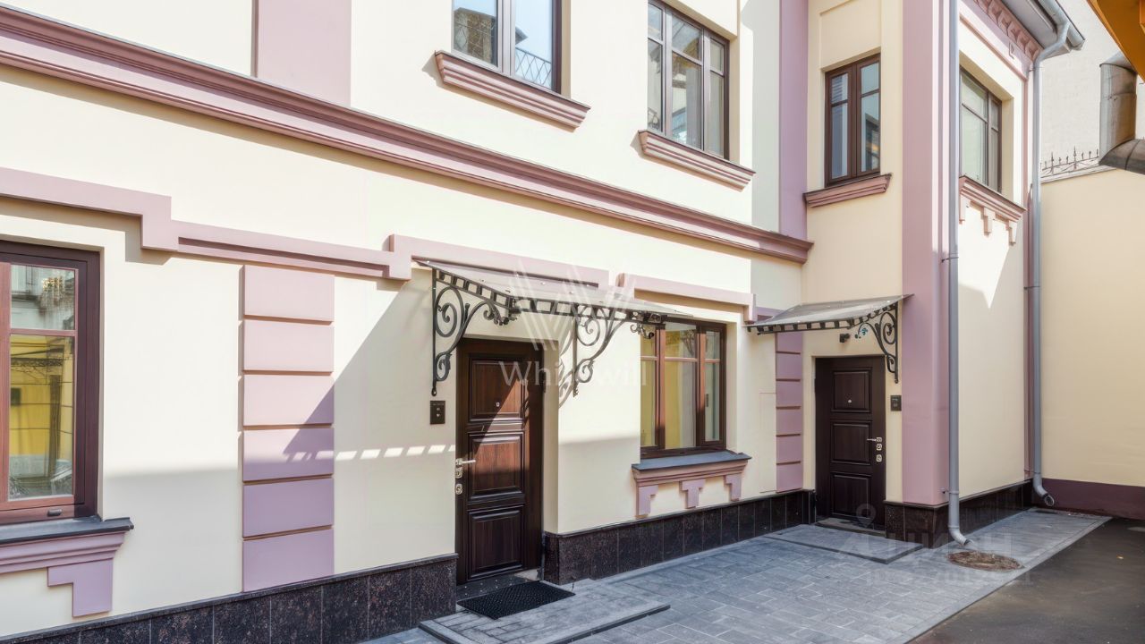 Трёхэтажный таунхаус с подвалом в Романовом переулке в районе Арбат. Историческое здание, построенное в 1899 году, отделка фасада выполнена штукатуркой бежевого цвета, украшением служат русты, карнизы и оконные кронштейны лилового оттенка. Внутри смешанная планировка включающая кухню-столовую, спальню с ванной комнатой, кабинет и постирочную с гардеробом. Интерьеры выполнены в светло-серых тонах с акцентными металлическими элементами. Все комнаты полностью меблированы и оснащены всей необходимой техникой. Для удобства передвижения установлен лифт. У входа предусмотрено одно парковочное место. Таунхаус подходит для жизни.