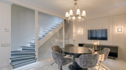 Трёхэтажный таунхаус с подвалом в Романовом переулке в районе Арбат. Историческое здание построенное в 1899 году, полная реконструкция с заменой межэтажных перекрытий на железобетонные была проведена в 2015 году. Отделка фасада выполнена штукатуркой бежевого цвета, украшением служат русты, карнизы и оконные кронштейны лилового оттенка. Внутри смешанная планировка включающая гостиную с санузлом, кухню-столовую и на последнем этаже — спальню с ванной комнатой. В подвале организован винный погреб. Интерьеры выполнены в светло-бежевых тонах с акцентными чёрными элементами. Все комнаты полностью меблированы и оснащены всей необходимой техникой. У входа предусмотрено одно парковочное место. Таунхаус подходит для жизни.