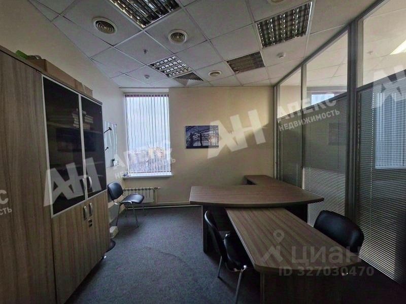 Помещение имеет кабинетную планировку с двумя входами и включает кабинет руководителя, несколько кабинетов, переговорную комнату, зону ресепшен, кухню и выделенную зону отдыха для сотрудников. Выполнена стандартная офисная отделка, что позволяет начать работу сразу после въезда. На фото представлен типовой вариант отделки.