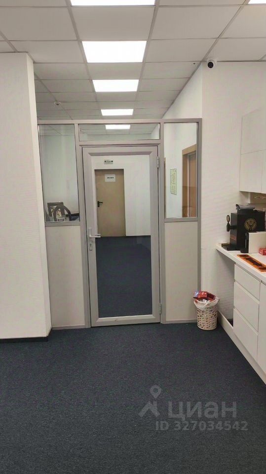 Ковролин во всем помещении, стеклянные перегородки, зона кухни с свч печью и местом под посудомойку.