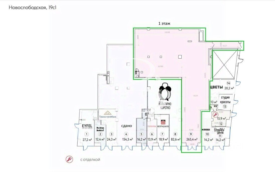 В аренду предлагается торговое помещение, расположенное на первой фасадной линии Новослободской улицы.