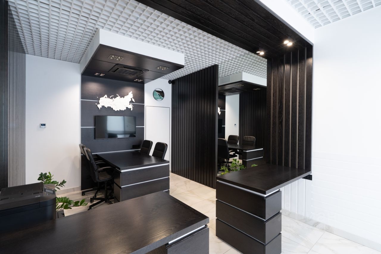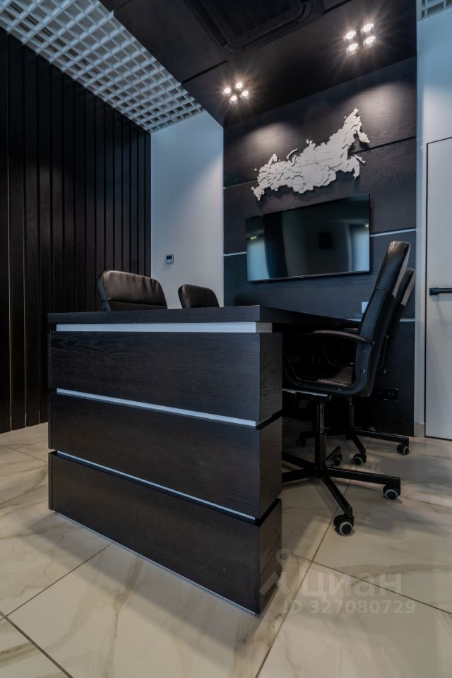 -офис на 4 сотрудника с возможностью ведения переговоров и видео конференций. Рабочие места изготовлены под заказ из премиальных материалов, офисные кресла, принтер, телевизор. Панарамные окна в пол с видом на 3-е кольцо с электрическими рол шторами. кондиционер и вентиляция.