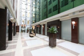 Современное здание 2008 года с просторным атриумом и панорамными лифтами.