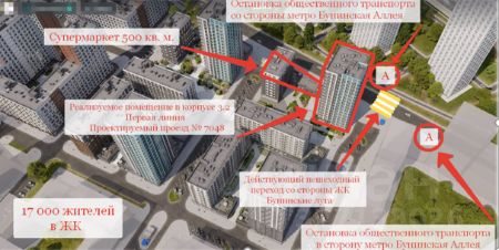 - Первая линия ЖК. Рядом с остановками общественного транспорта от/до метро, действующий пешеходный переход со стороны ЖК Бунинские луга.