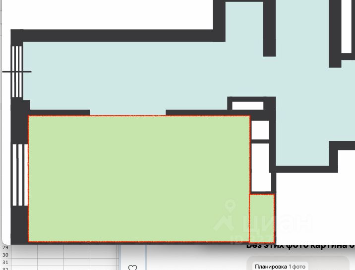 Площадь 22 метра. Возможно увеличение за счет общих зон. Также сдают нарезки при входе от 5 метров .