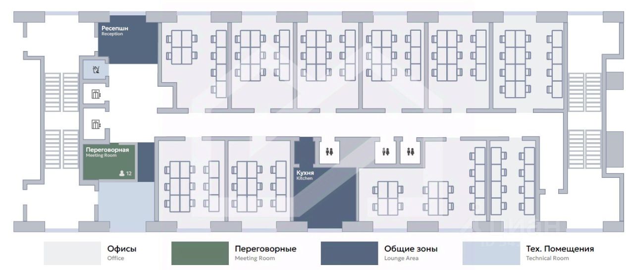 1074463-o . Предлагаем в аренду сервисный офис площадью 498,4 кв. м, на 90 рабочих мест, расположенный в бизнес-центре "Арма"