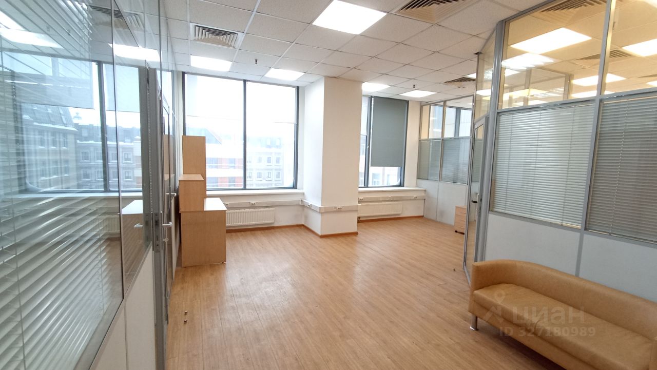 Площадь - 70,7 м². Третий этаж 13-этажного офисного здания. Большие окна выходят на внутреннюю территорию. Установлены межкомнатные алюминиевые перегородки со стеклом и дверями.