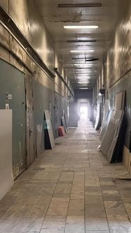 Ворота на 0 уровне, далее по коридору порядка 50 метров до склада.