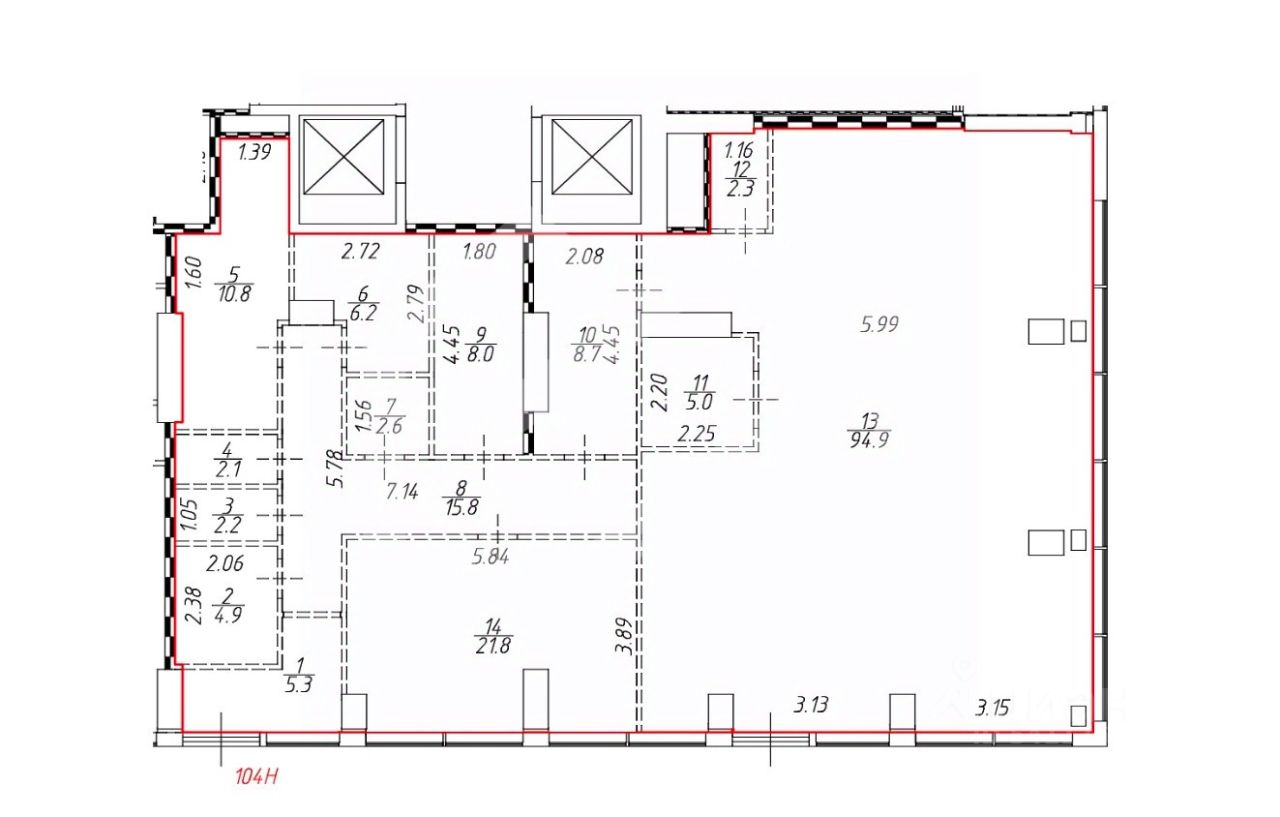 -формат: опенспейс + 2 санузла;