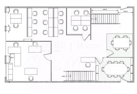 - Планировка: смесь открытых пространств, кабинетов и зон со стеклянными перегородками
