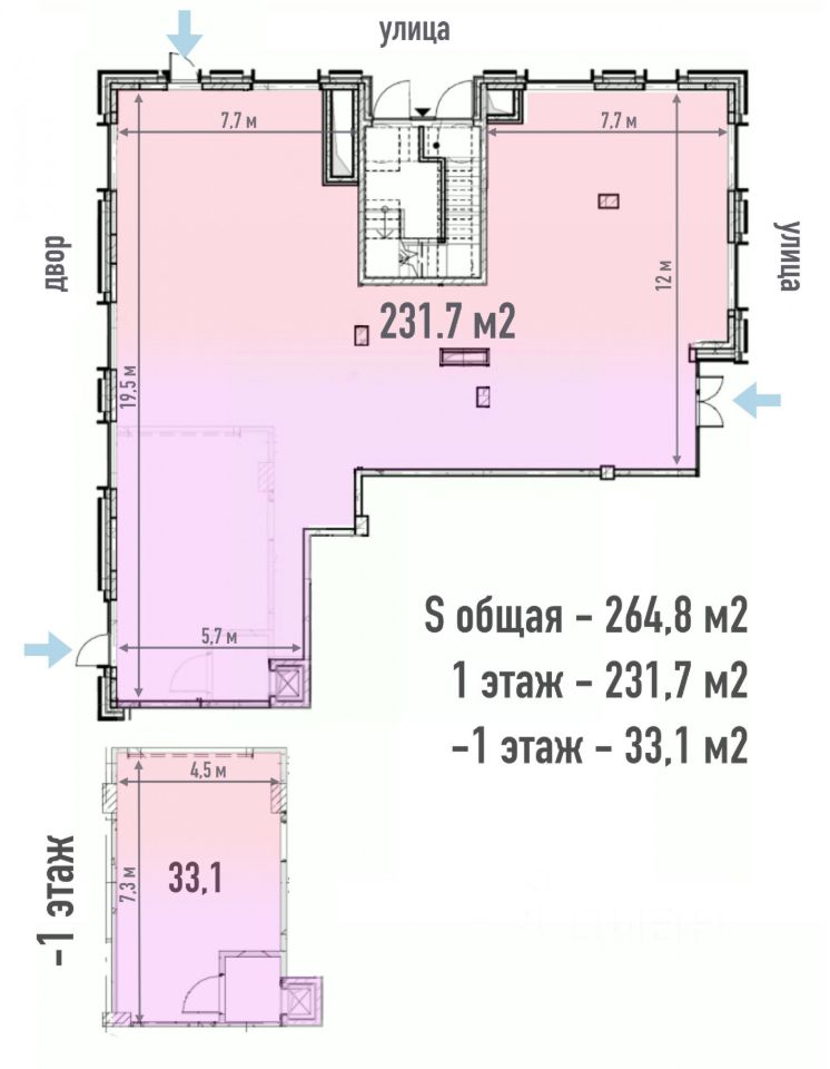 - 231,7 м² на уровне 1 этажа с двумя входами (основной — на пешеходный бульвар, дополнительный — со двора).