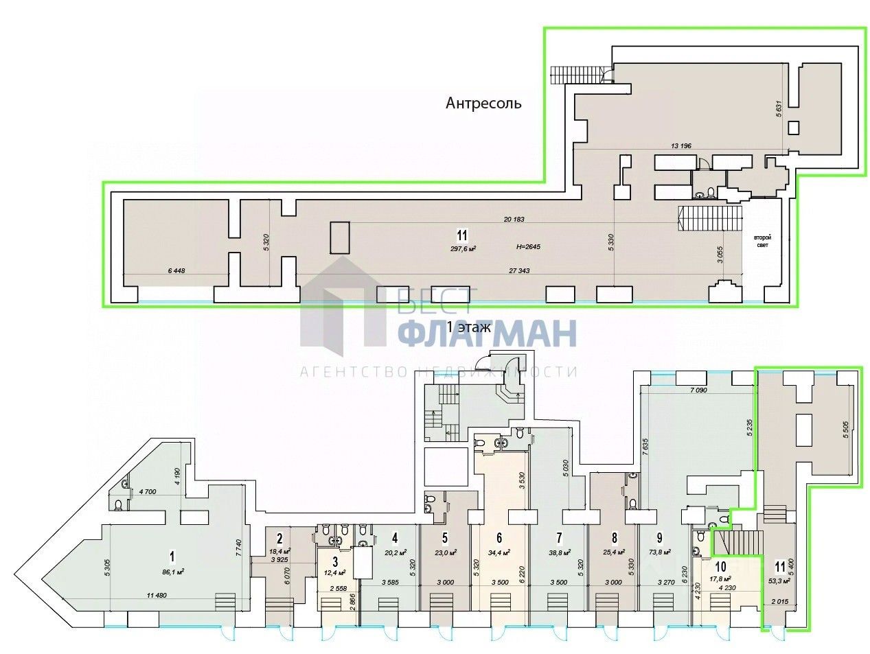 1 этаж 53,3 кв.м. + антресоль 297,6