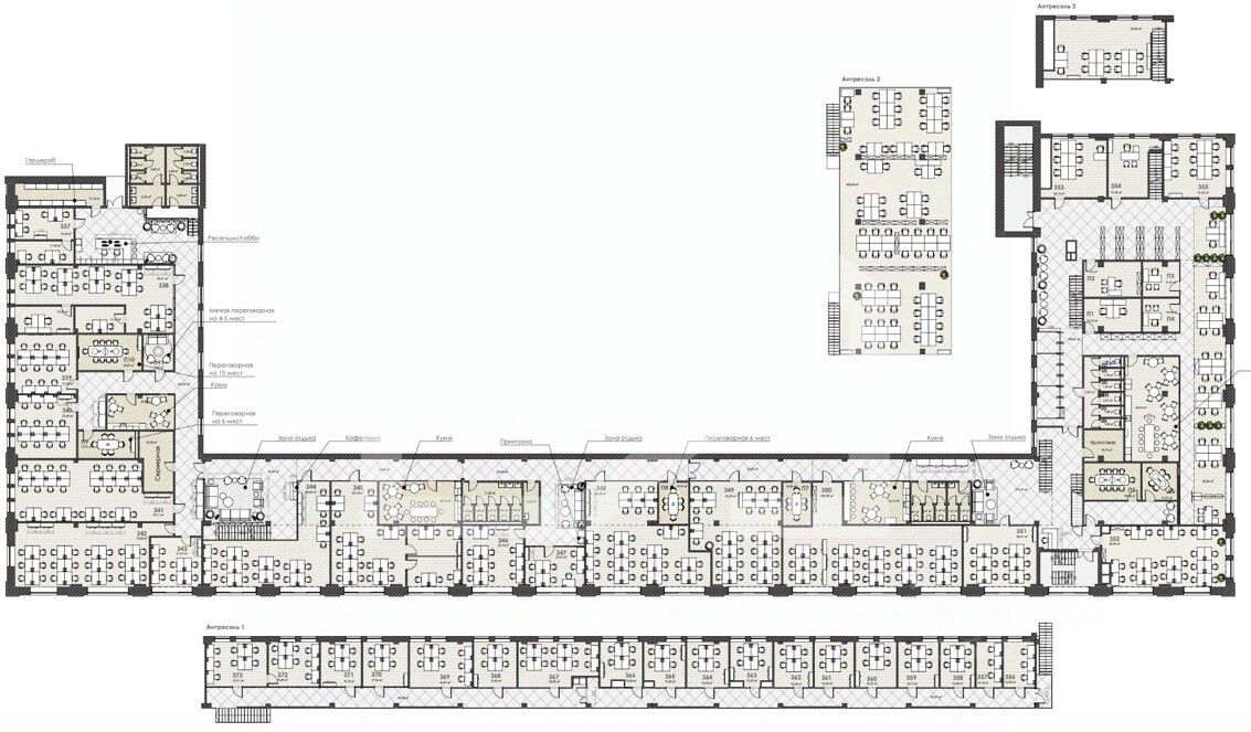 - Планировка смешанная: индивидуальная кухня, переговорные, мягкие зоны и санузел