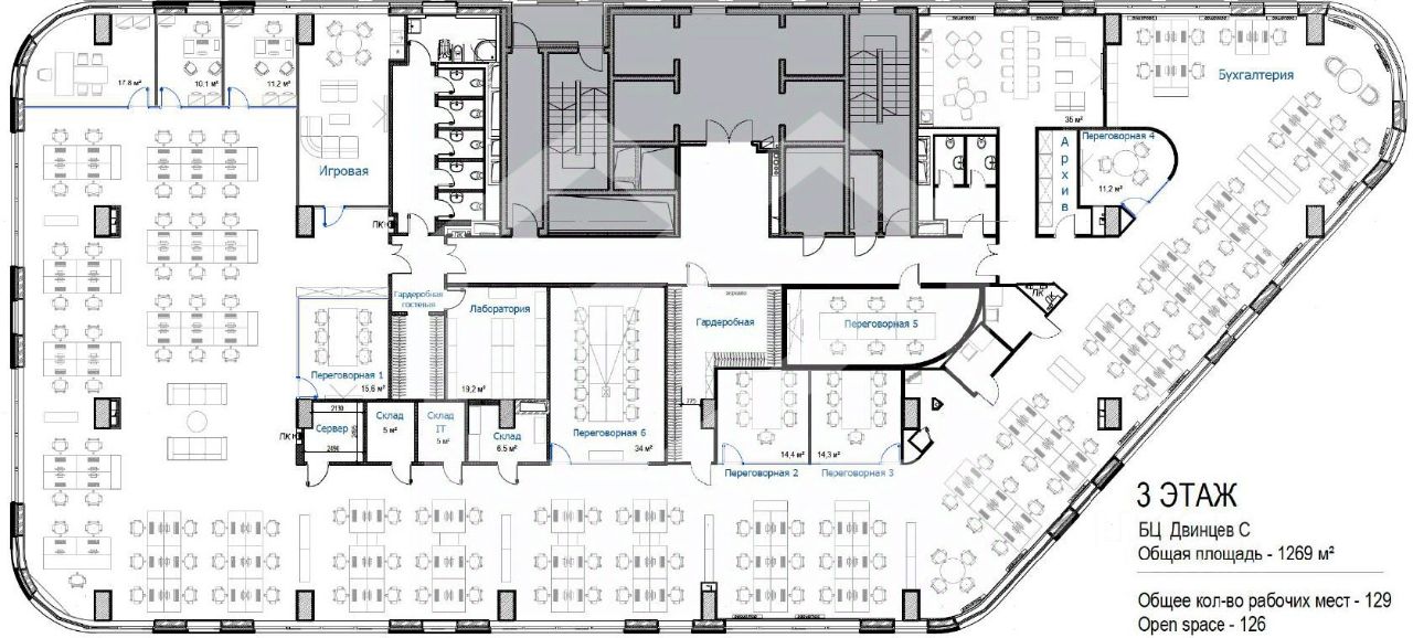 1098426. Предлагаем в аренду офисное помещение площадью 1 269 кв. м, расположенное в бизнес-центре "Двинцев"