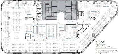- Планировка смешанная: открытое пространство, кабинеты, переговорные (установлены стеклянные перегородки), переговорные кабинки, серверная, кухня, с/у.