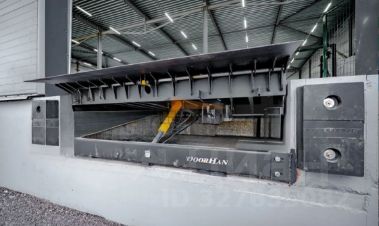 3 въездных ворoта DооrHаn с уpaвнительнoй плaтформoй. Отметка пола 1.2 м — уровень с кузовом фуры.