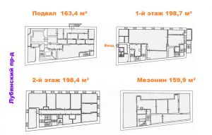 1-й этаж 198,7 м², 2-й этаж 198,4 м², подвал 163,4 м², мезонин 159,9 м².