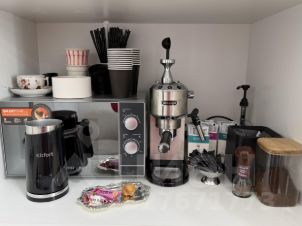 Расходные материалы — мицеллярная вода, пелёнки, ватные диски и палочки. Угощение для клиентов — чай, кофе, орешки, конфеты.