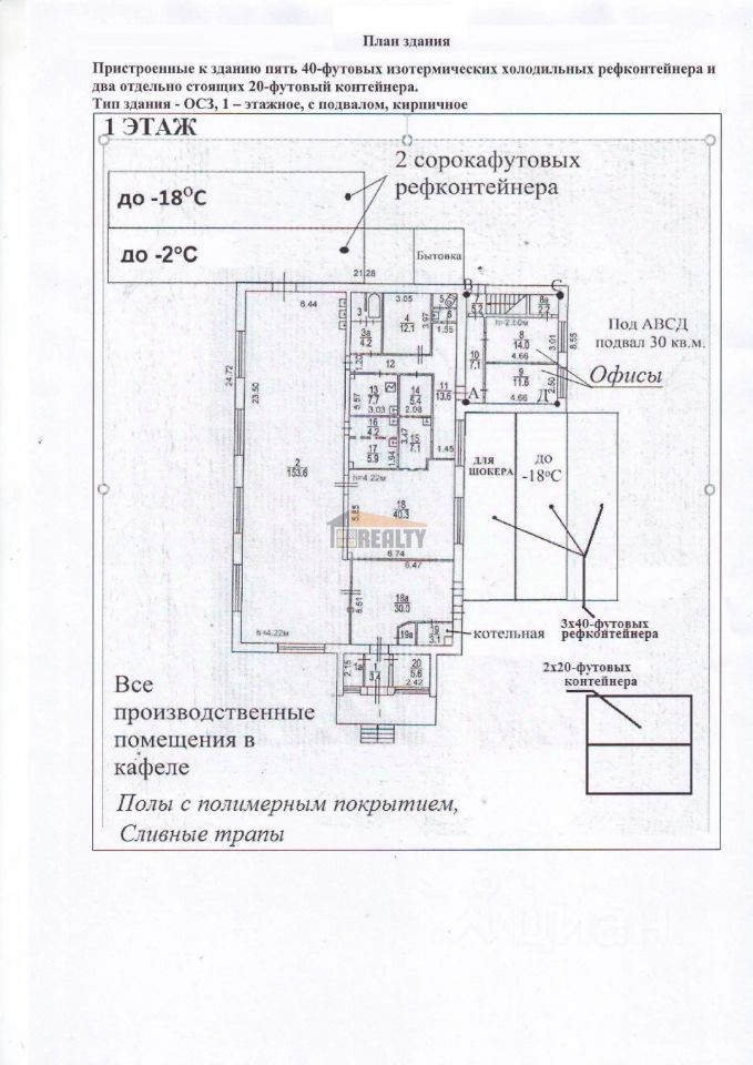 Все производственные помещения в кафеле. Потолки 4м. Полимерный пол, сливные трапы во всех производственных помещениях. Множество точек воды и парных электроточек по цеху 220-380 V. выделенная электрическая мощность - 150 кВт, возможно увеличение (условия обсуждаются дополнительно). Есть помещение под коптильное отделение с отдельной вентиляцией. Приточная и отточная вентиляция. Автономное отопление. Пожарная сигнализация. Планировка здания позволяет организовать любое пищевое производство без пересечения потоков сырья и готовой продукции.