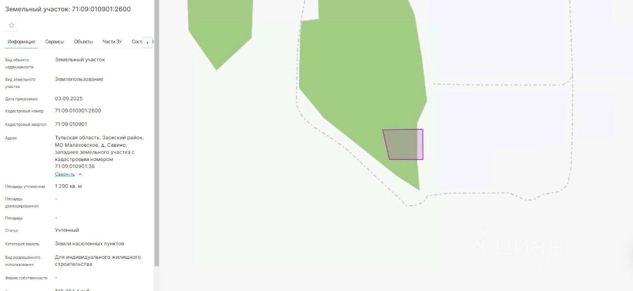 право заключения договора аренды земельного участка из земель населенных пунктов с кадастровым номером 71:09:010901:2600, площадью 1290 кв.м, местоположение: Заокский район, МО Малаховское, д. Савино, западнее земельного участка с кадастровым номером 71:09:010901:38, вид разрешенного использования: для индивидуального жилищного строительства.