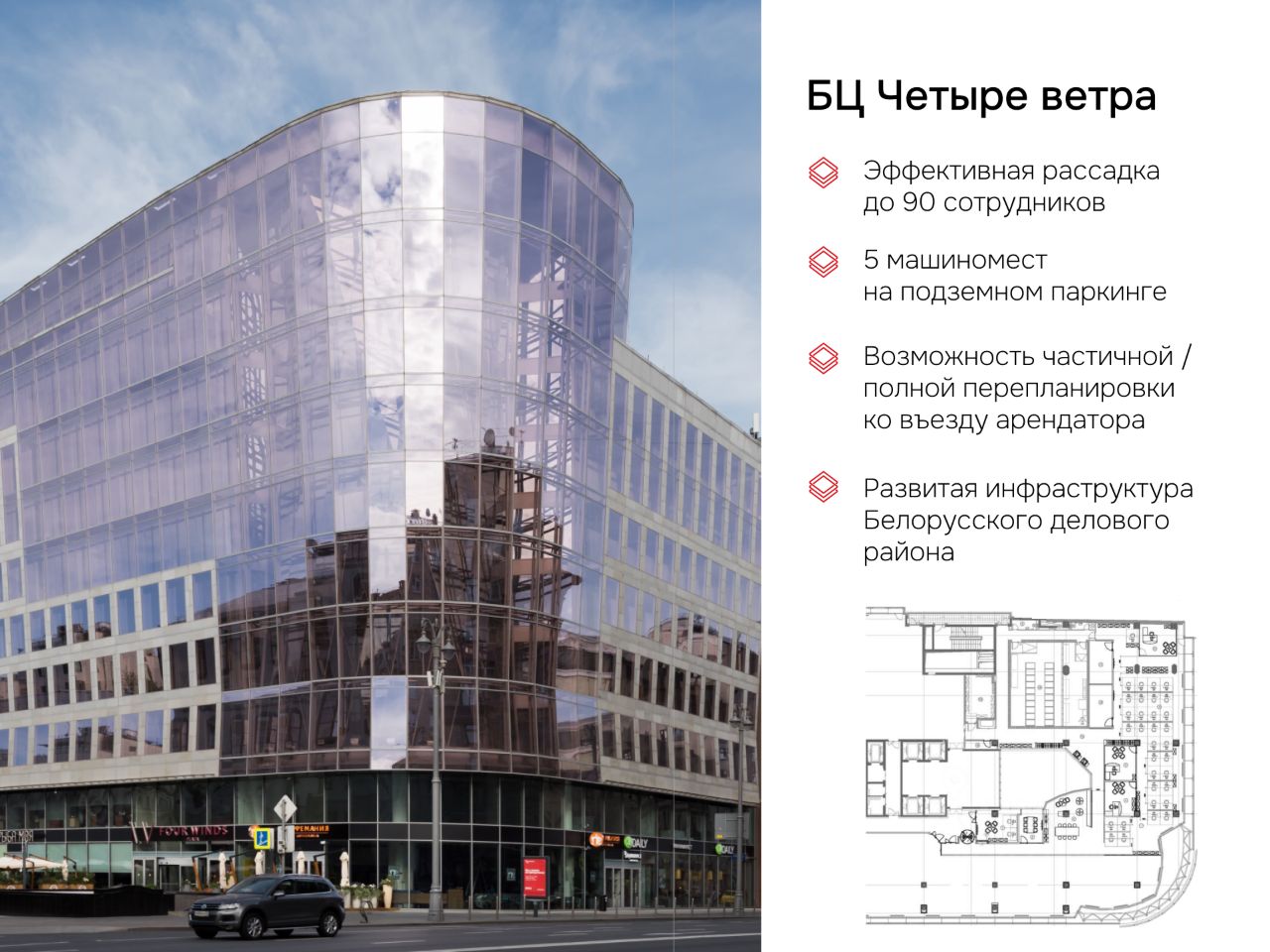 - Four Winds Plaza расположен по адресу 1-ая Тверская-Ямская улица, д. 21;