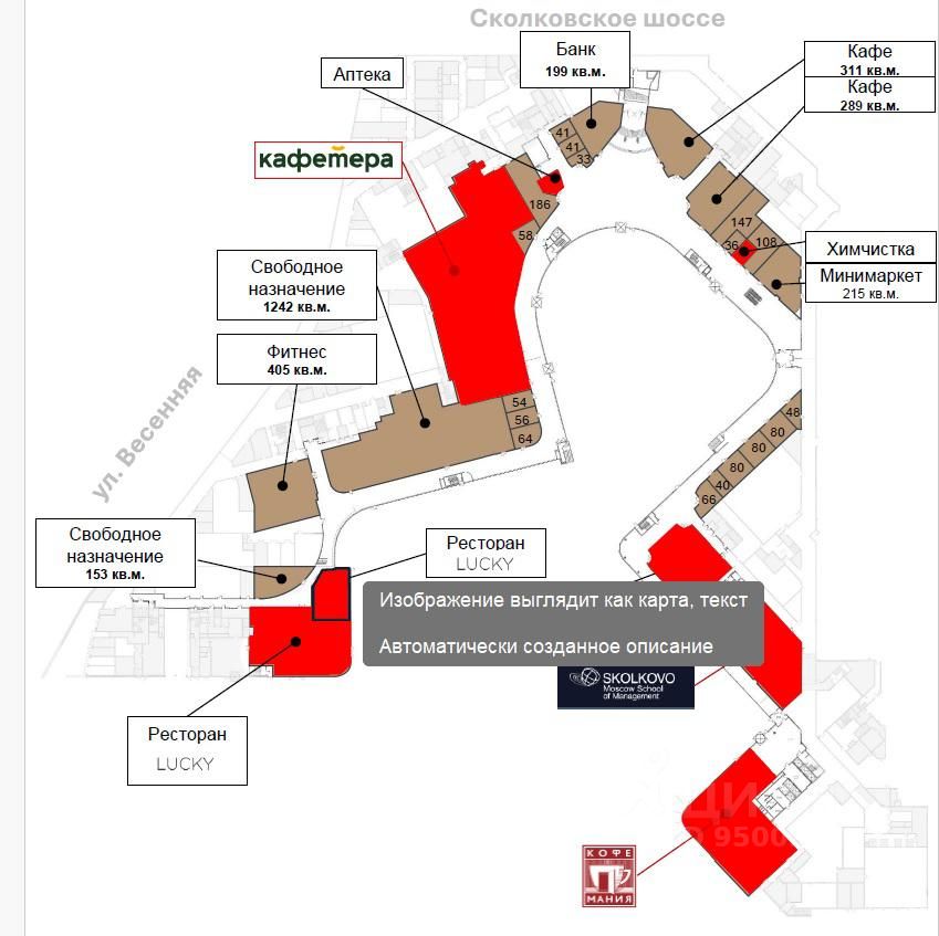 Лот: 38586. Аренда торговых помещений в Деловом квартале Сколково парк. БЦ в процессе заполнения. Введены 2 офисных корпуса (1 корпус сдан - заезд арендатора возможен в марте 2025, 2й корпус - заехал офисный арендатор, выполняется отделка до апреля 2025). 3 и 4 корпус ввод без отделки 1 кв. 2025, с отделкой - ближе к осени 2025, 5 и 6 корпус - ввод в конце 2025 года. Предусмотрены 128 гостевых парковочных мест. Ожидается около 1000 сотрудников к апрелю 2025 + 1000 сотрудников к осени 2025 г. Открытие торговой галереи - 01.06.2025 г. Вакатные площади от 150 до 1250 м2.
