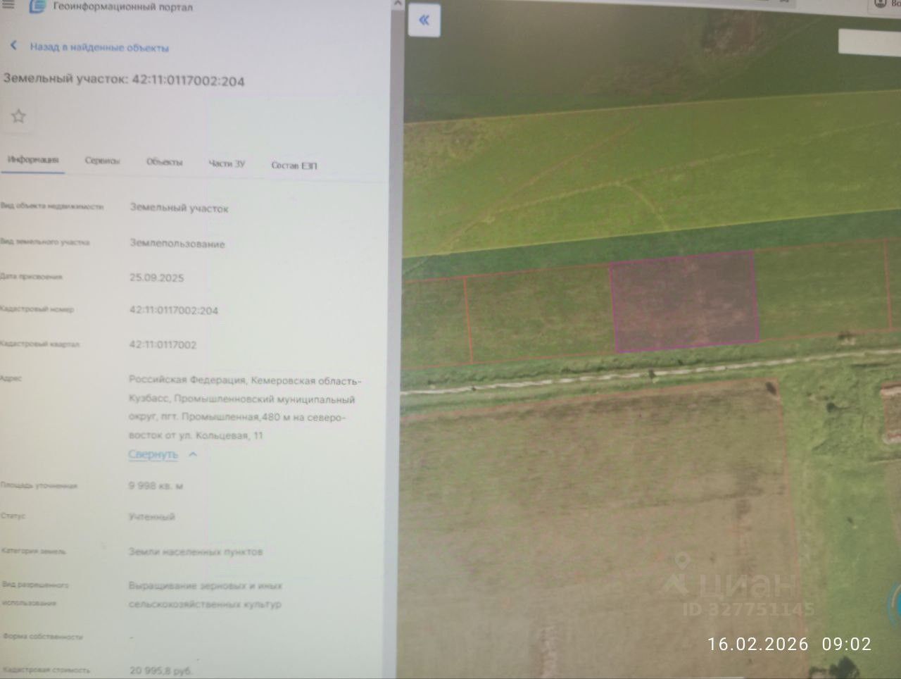земельный участок с кадастровым номером 42:11:0117002:204, площадью 9 998 +/- 35 кв.м., расположенный по адресу: Российская Федерация, Кемеровская область - Кузбасс, Промышленновский муниципальный округ, пгт. Промышленная, 480 м на северо-восток от ул. Кольцевая, 11. Категория земель: земли населенных пунктов. Разрешенное использование земельного участка: выращивание зерновых и иных сельскохозяйственных культур.