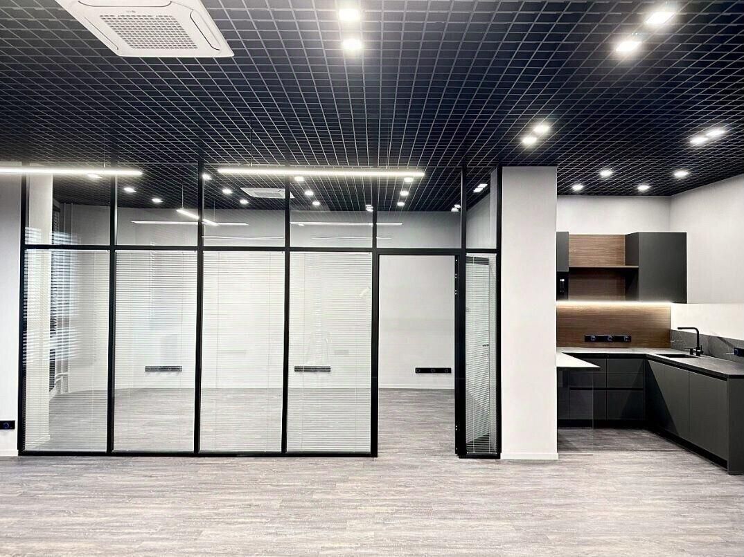 — Open space + изолированный кабинет руководителя (или переговорная) со стеклянными перегородками и встроенными жалюзи