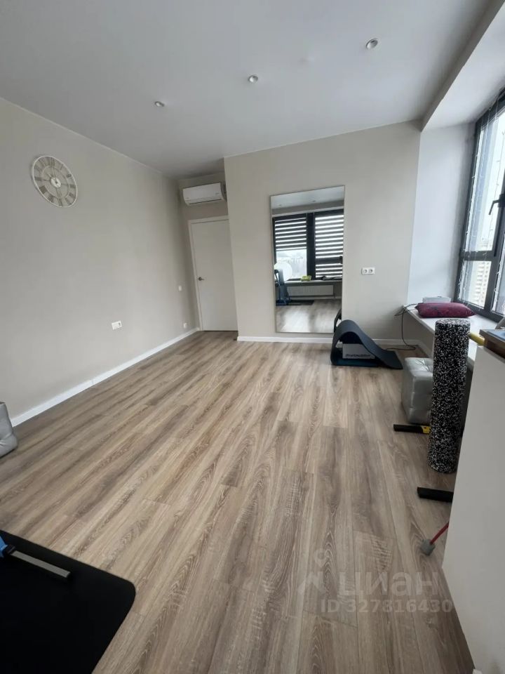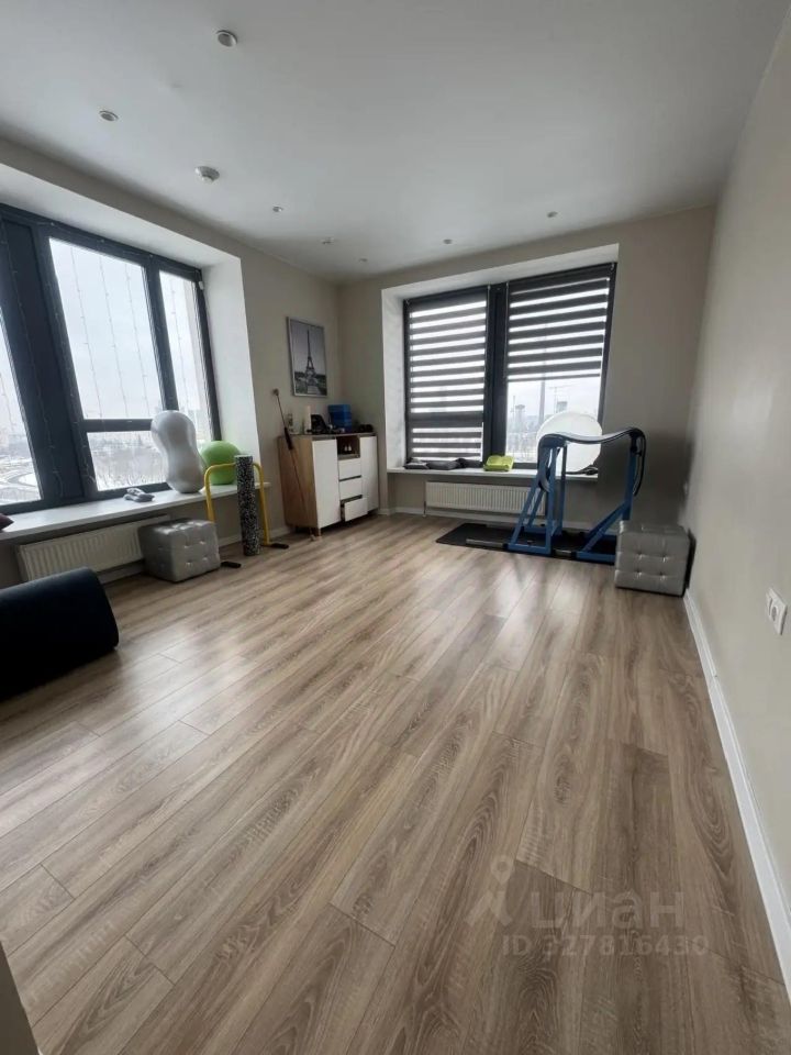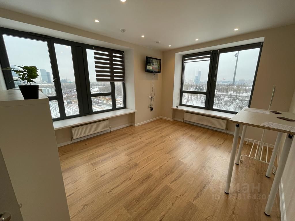 1. Одна комната с панорамными окнами (вид на Парк Победы и на Сити), вторая с кухней;