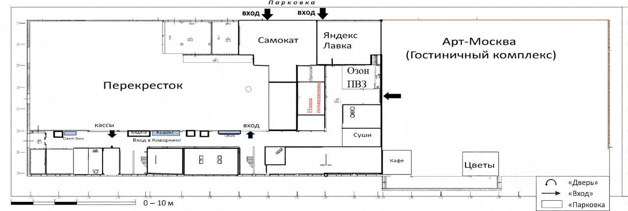 Высокий трафик: Помещение находится в оживленном месте, рядом с якорным арендатором — пунктом выдачи OZON, супермаркет Перекресток (поток клиентов обеспечен).