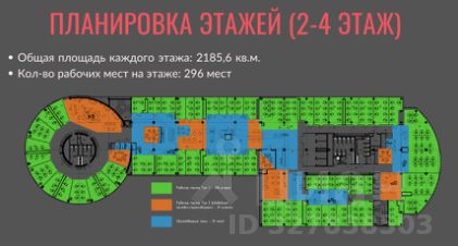 Офисное пространство имеет эффективную планировку на 296 рабочих мест. Предусмотрены кабинеты на 275 мест, 21 рабочее место в общем пространстве, переговорные, мягкие зоны для отдыха и общения, кухни со встроенной техникой, телефонные кабинки для индивидуальной работы, зона ресепшена, готовая серверная.