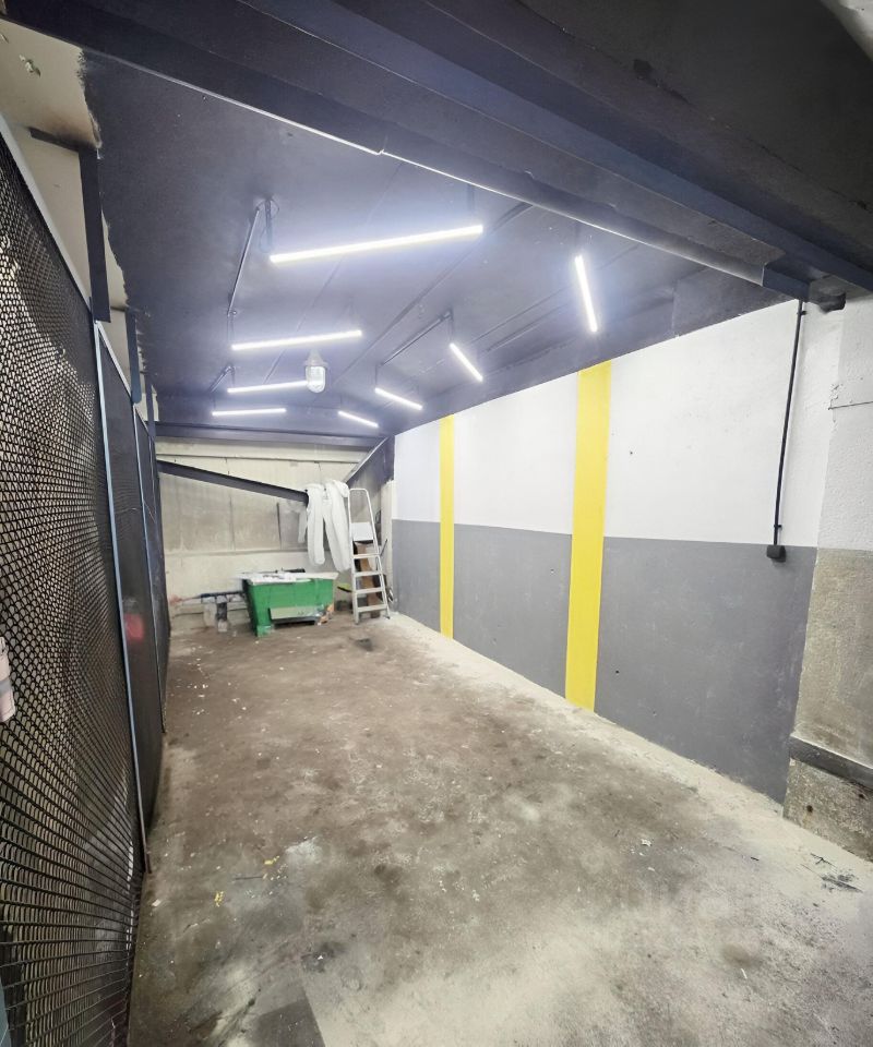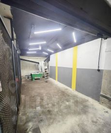 Гараж огорожен сеткой рабицей, ворота. Одна стенка монолитная, возможно размещение навестных систем хранения (обсуждается индивидуально)
