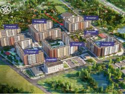 Комплекс состоит из 6 домов переменной этажности (от 12 до 15 этажей - все корпуса сданы и заселены!!), наземного паркинга, детского сада и школы.