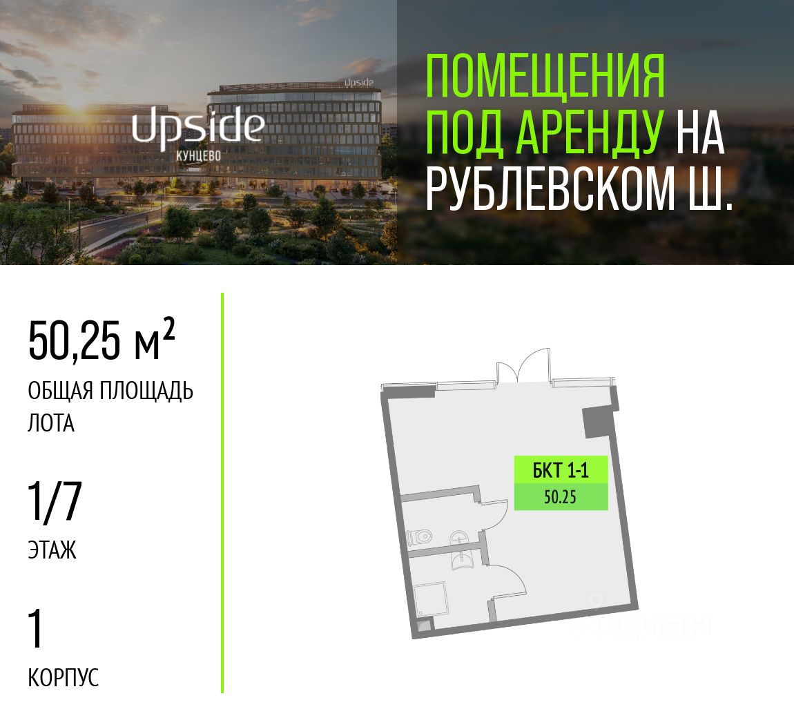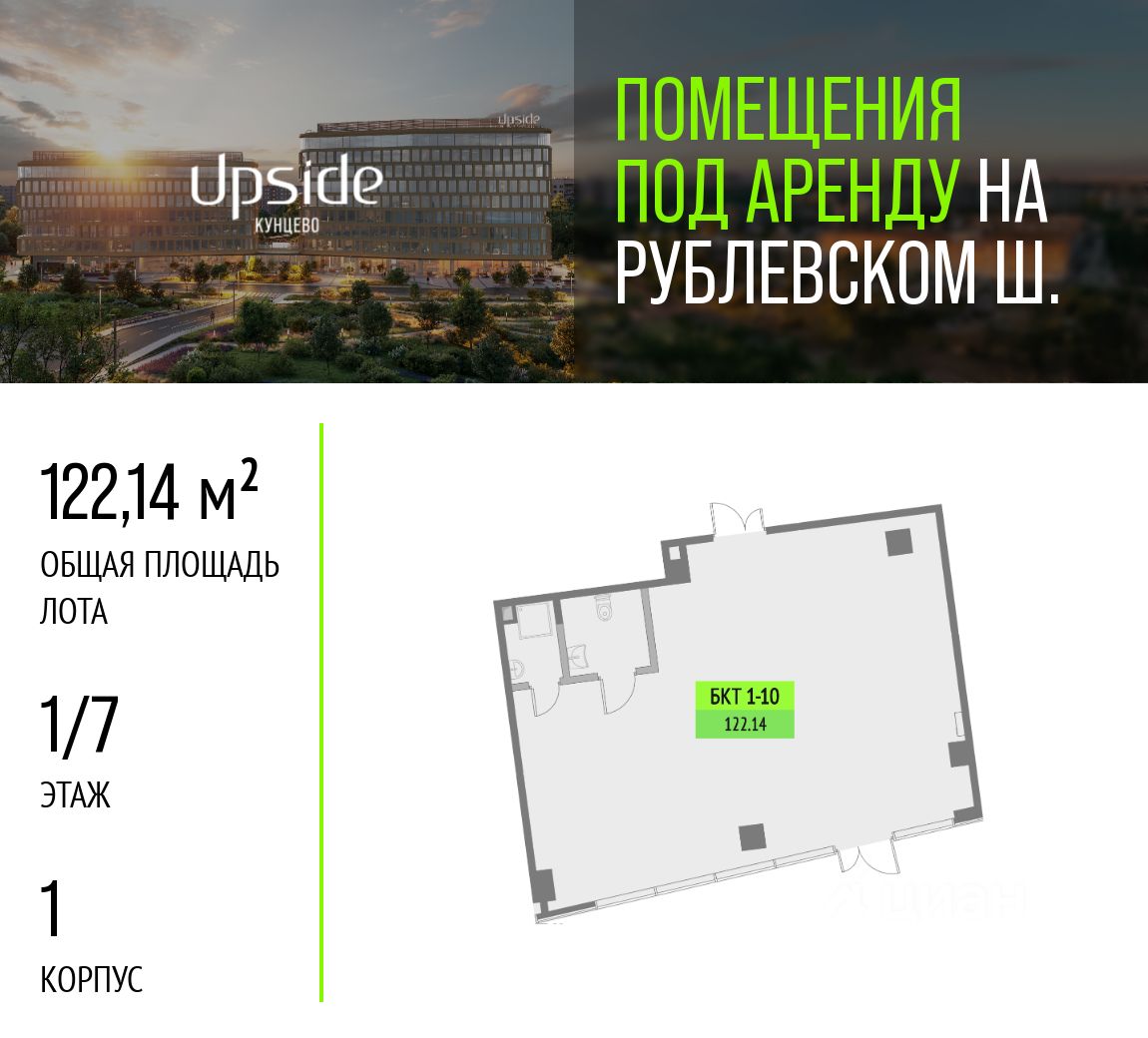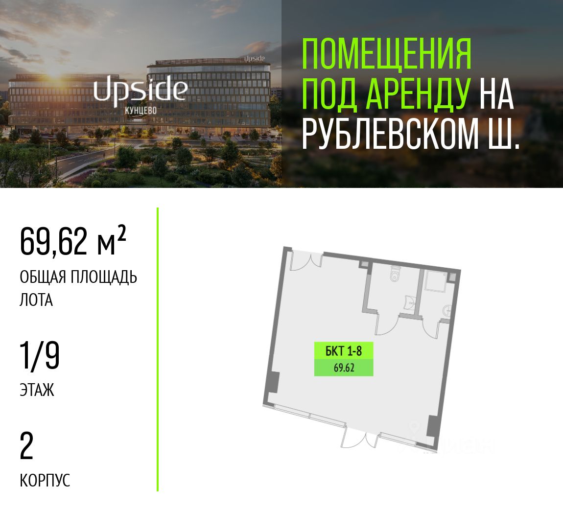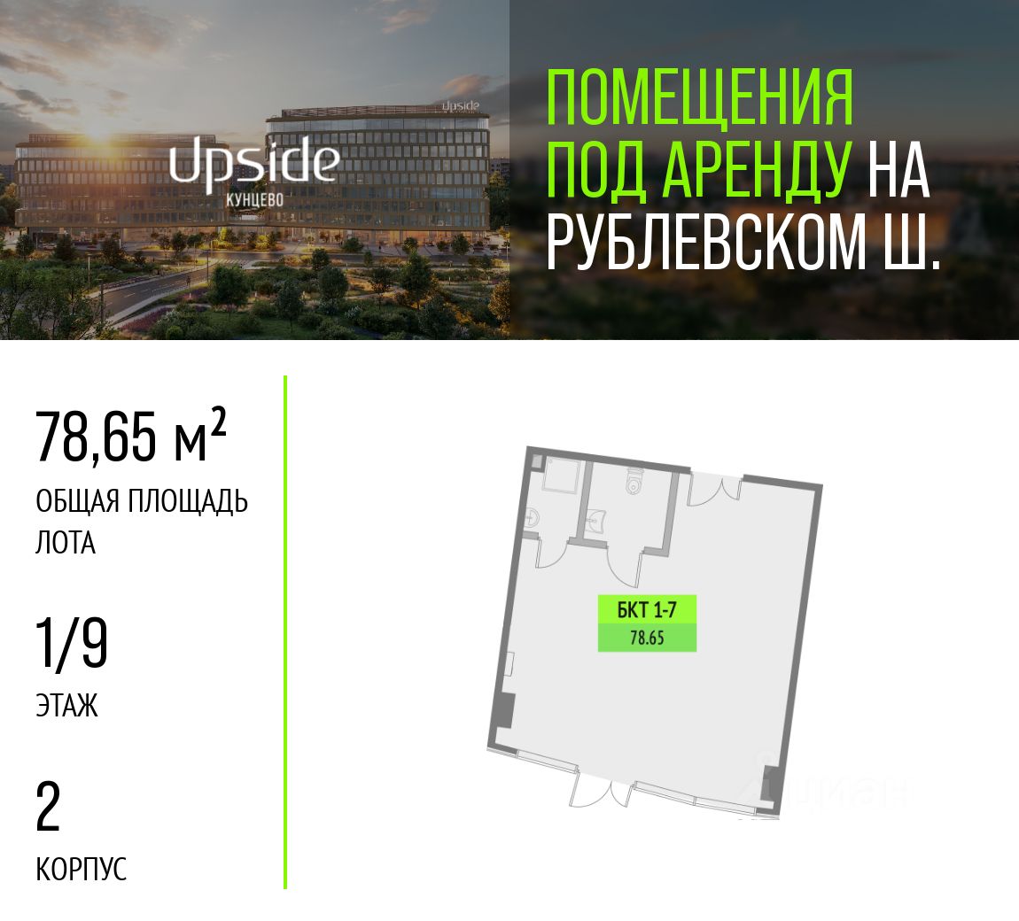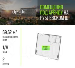 Предлагаются в аренду помещения различной площади и назначения. Помещения находятся на первом и втором этажах нового бизнес-центра класса "А" Upside Кунцево, на престижном западе Москвы. Upside Кунцево состоит из двух корпусов 7 и 9 этажей, гармонично вписанных в природный ландшафт. Всего 2 минуты пешком от трех веток метро Кунцевская и одноименной платформы БКЛ. Upside Кунцево находится в хорошем проходимом месте района, на пути жителей района от метро и граничит с городским парком - высокая видимость и постоянный пешеходный трафик гарантированы. Преимущества: - Престижная локация и высокий имидж бизнес-центра класса А. - 2 минуты пешком от трех веток метро Кунцевская и платформы БКЛ. - Максимальная проходимость - жители района плюс сотрудники БЦ. - Граничит с городским парком - дополнительный приток посетителей круглый год. - Витринные фасады и удобный доступ с пешеходных путей.