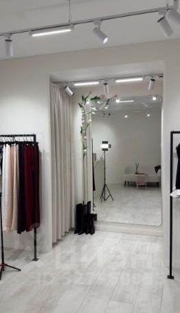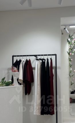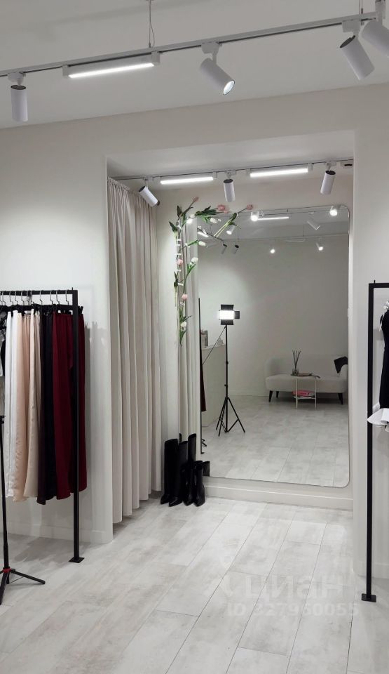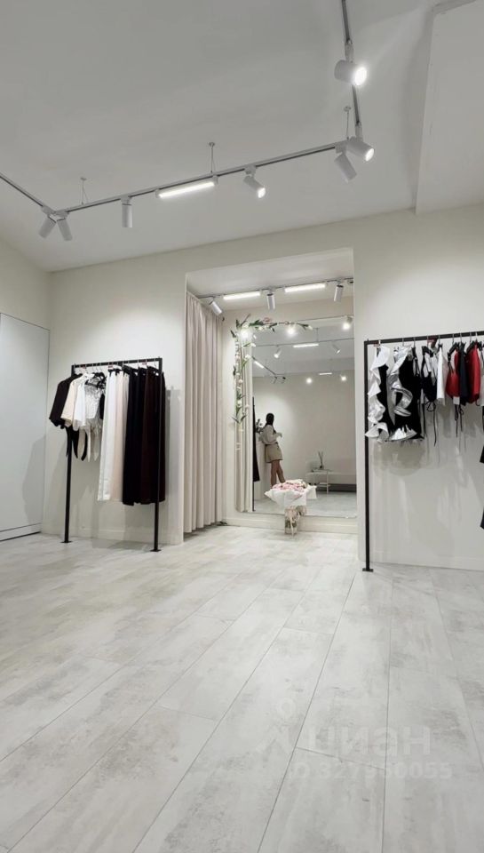 Огромные шкафы для хранения вещей, красивые рейлы, стол ресепшен, красивая примерочная с дорогим светом.