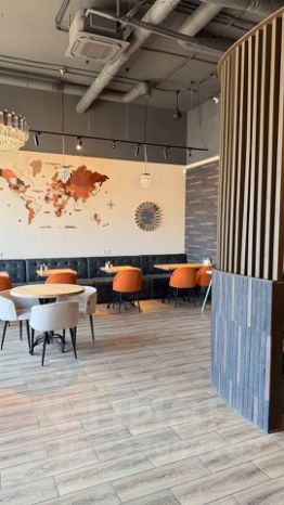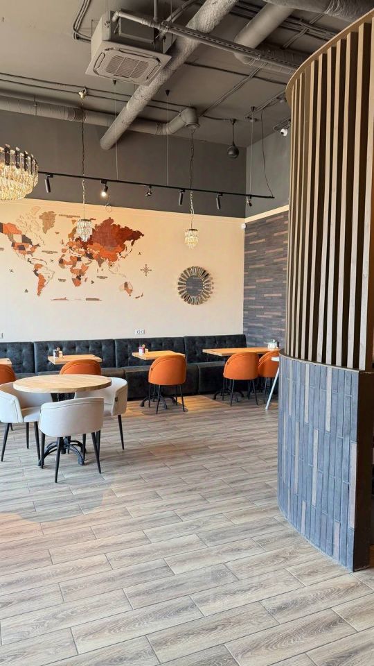 1. Гастрономический зал (~40 м²): 20 посадочных мест, барная стойка, зона для гостей (столы, стулья, диванные зоны). Современный интерьер в бежево-коричневых тонах, деревянная карта на всю стену.