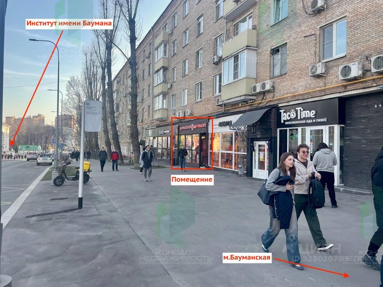 Вход в помещение и витринные окна выходят на улицу 2-я Бауманская, на которой в свою очередь расположен Институт имени Баумана, что обеспечивает сверхинтенсивный пешеходный поток.