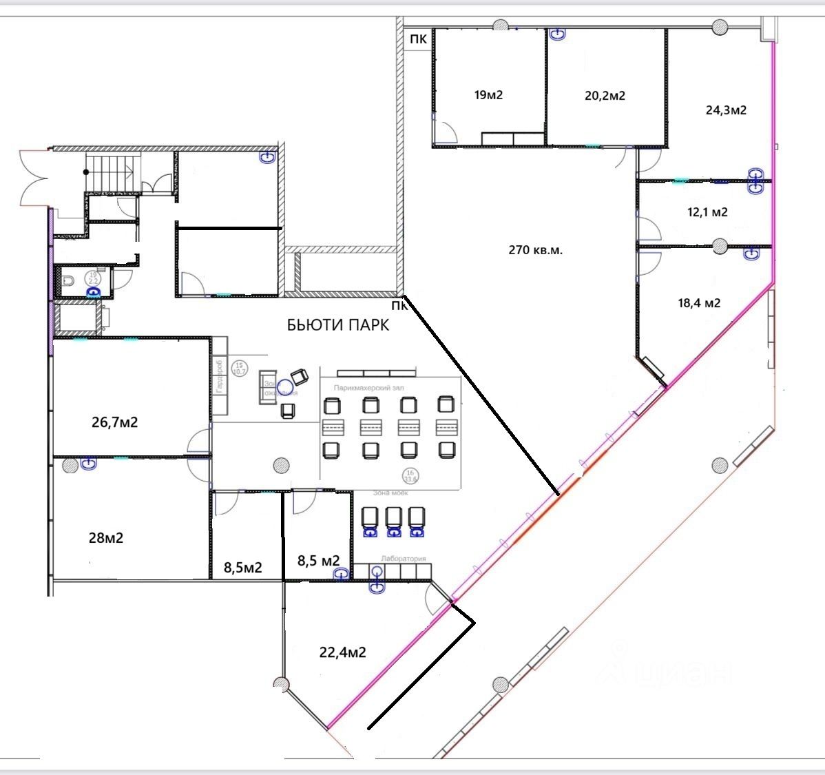 Помещение расположено у центрального входа. 1/2 помещения БЬЮТИ ПАРК София. Прямой договор с собственником. Сейчас на территории помещения несколько выделенных помещений, но их можно снести (сданы в субаренду, можем передать вам как арендный бизнес).