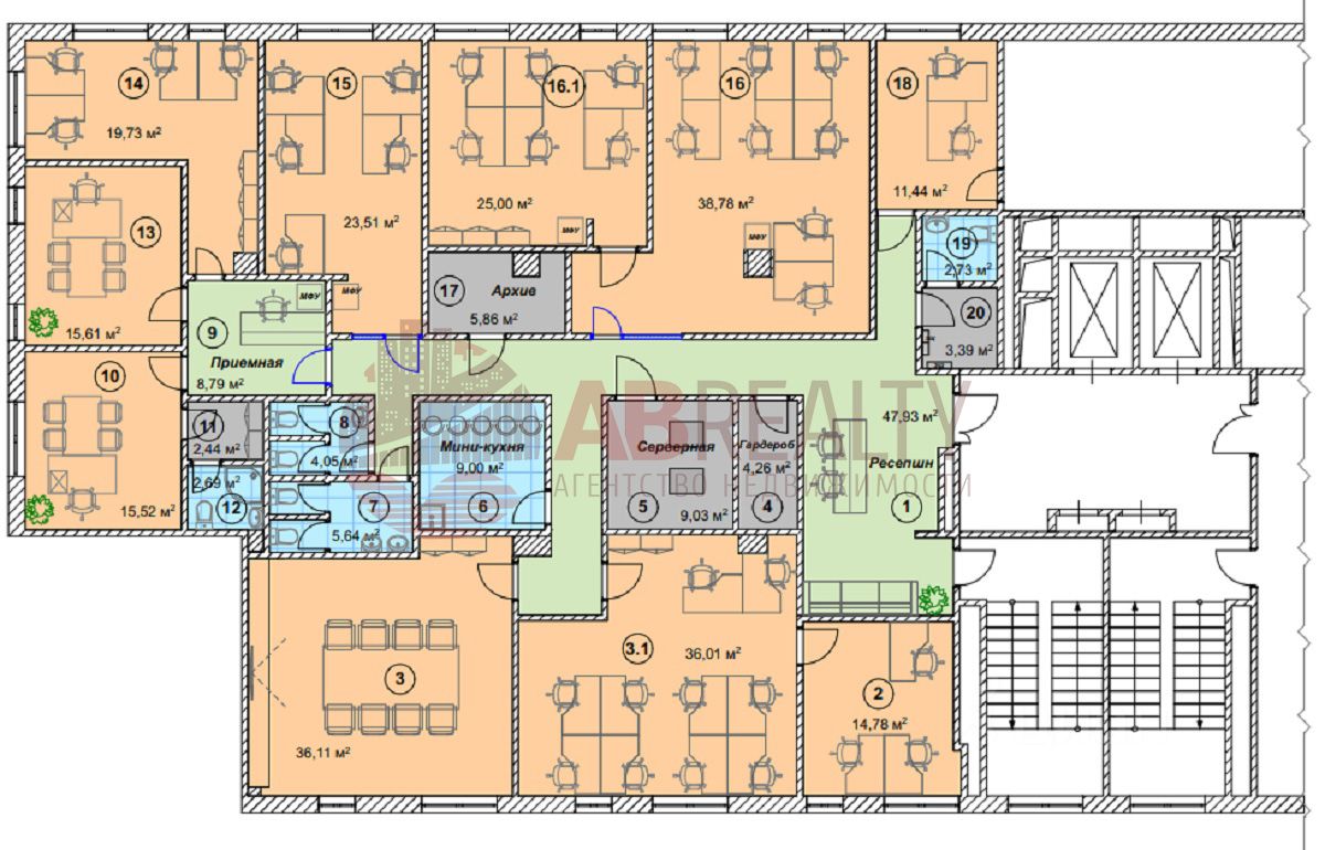 Планировка смешанная: гардероб, приемная, ресепшн, кабинет руководителя, open-spaсe, серверная, кабинеты, переговорная, архив, кухня с необходимой техникой и зоной приема пищи, 4 санузла.