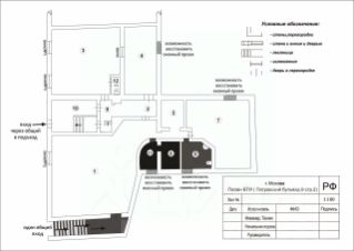 Вход: Через арку с Бульварного кольца. Большой пешеходный трафик. 2 входа в помещение. Отдельный вход с торца здания и через жилой подъезд.