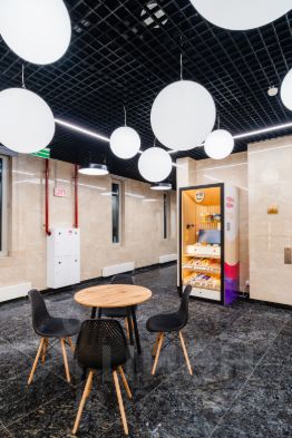 Первый этаж - лифт, место приема пищи с мокрой точкой (вендинг-кофе-пойнт общей площадью 77 кв.м.) пурифайер, холодильники, проточный кипятильник, СВЧ печь, столы на 15 посадочных мест.