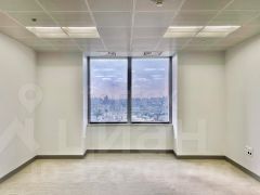 Блок 1043 м² — более открытый по ощущению офис с ресепшн, open space и стеклянными переговорными. Недавний ремонт, светлая гамма, комбинированный пол и встроенный свет дают ровную деловую среду без лишней декоративности. Из окон открывается высокий вид на город.