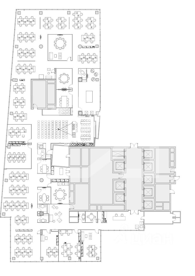 - Планировка смешанная: 6 кабинетов, 11 переговорных, серверная, конференц-пространство, игровая комната, большая кухня