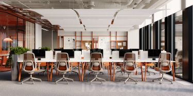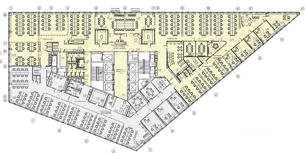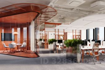 Планировка смешанная и включает открытые пространства для команд, изолированные кабинеты и переговорные комнаты. На этаже оборудованы кофе-поинты и мини-кухни для комфорта сотрудников.