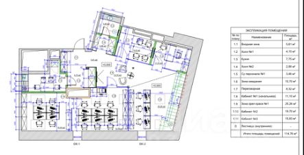 115 м2: Open space (25 м²), кабинет руководителя, переговорная, 2 рабочих кабинета, кухня, с/у.