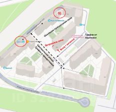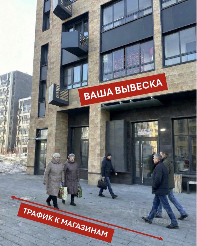 Витринные окна и вход на трафик, основной двор и детскую площадку. Напротив помещения расположен въезд в подземный паркинг, а также, стихийная парковка, что обеспечивает дополнительный автомобильный трафик.