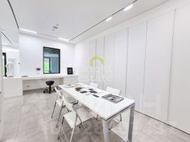 Пространство выполнено в современном стиле в светлых тонах, создающих комфортную рабочую атмосферу. Функциональная планировка включает рабочую зону, оборудованную кухню с посудомоечной машиной и санузел — идеальное решение для небольшого офиса, представительства или кабинета.