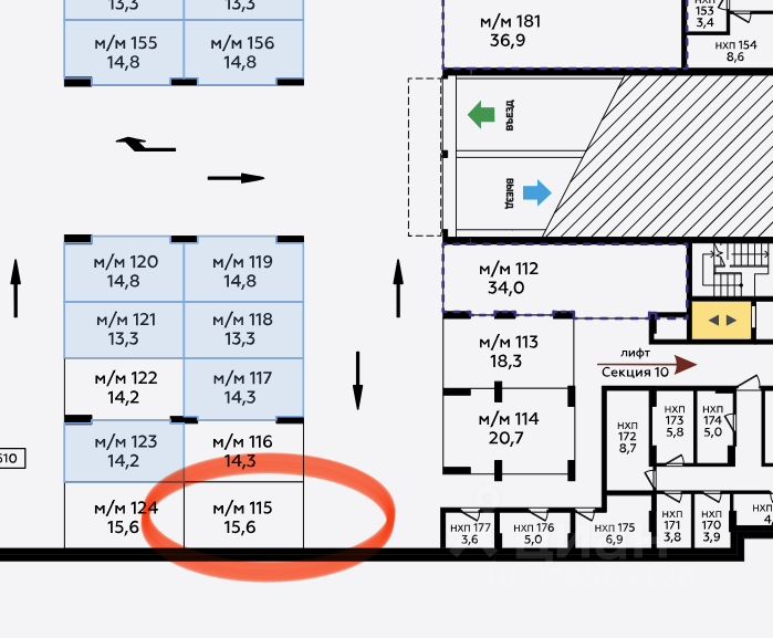 Машино-место 115, -2 этаж, расположено рядом с секцией 10.