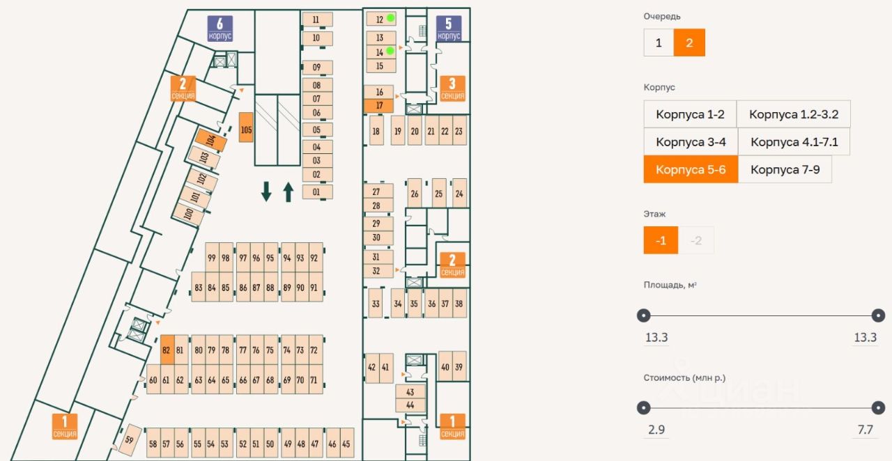 Одноуровневый паркинг на -1 этаже, место 12 (у стены с возможностью установки зарядной станции для электромобиля) или место 14.